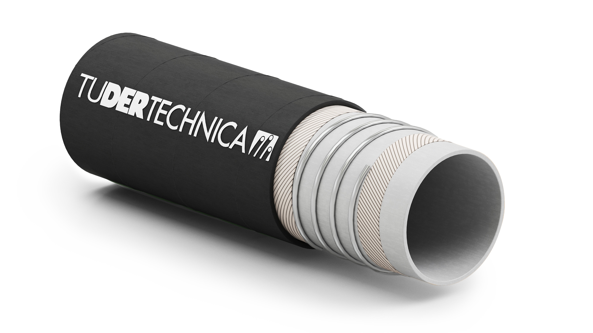 Tuyau EPM blanc, lisse, vulcanisé au peroxyde accéléré, résistant à la chaleur. Revêtement semi-ondulé en polymère synthétique noir, impression toile, augmentant la flexibilité, ignifuge conforme V-0 UL 94:2023. Revêtement noir ignifuge conforme V-0 UL 94:2023. Température d’utilisation: -40°C à +120°C. Adaptabilité maximale dans des espaces restreints. Raccords disponibles.